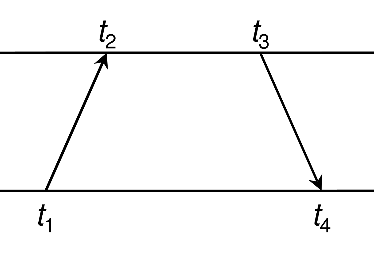 Delay = (t4 – t1) – (t3 – t2)